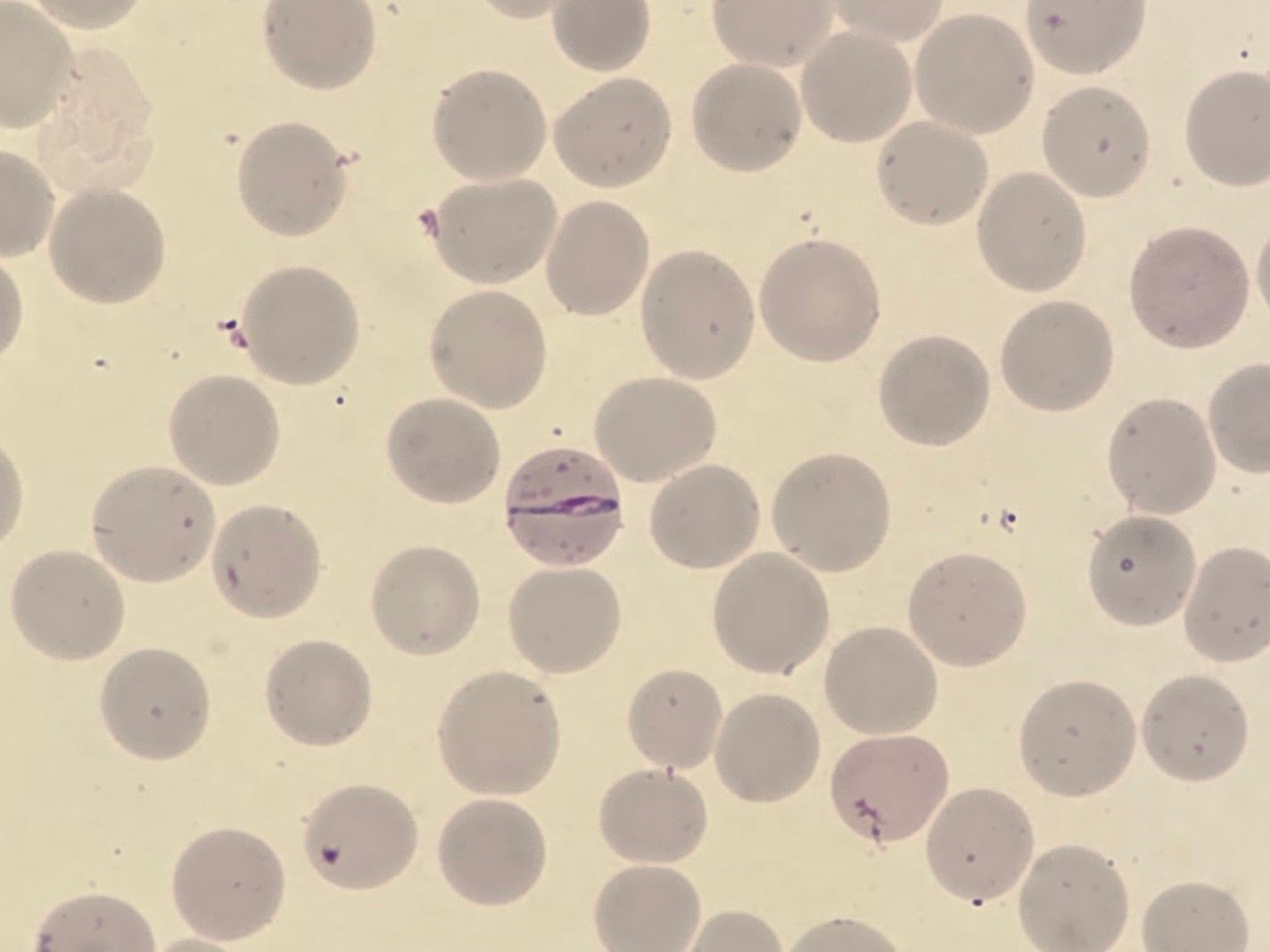 On the film, note the single infected red cell near the centre, displaying a striking band-like form — a morphology more commonly associated with P. malariae. However, in this case, further features point to P. falciparum, including the presence of Maurer’s clefts and the travel history.